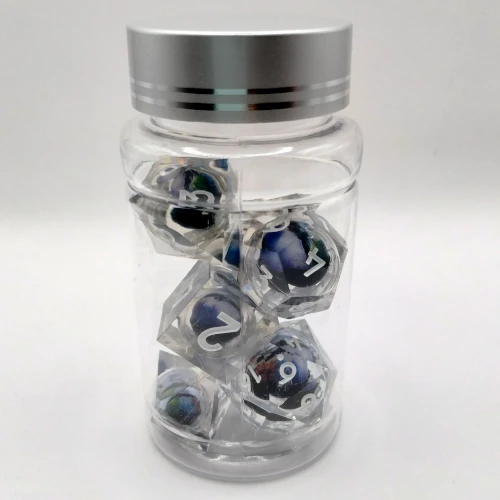 Kit de dés "Liquid Core" Oeil de Dragon - transparent avec oeil multicolore dans une bouteille avec couvercle dévisable